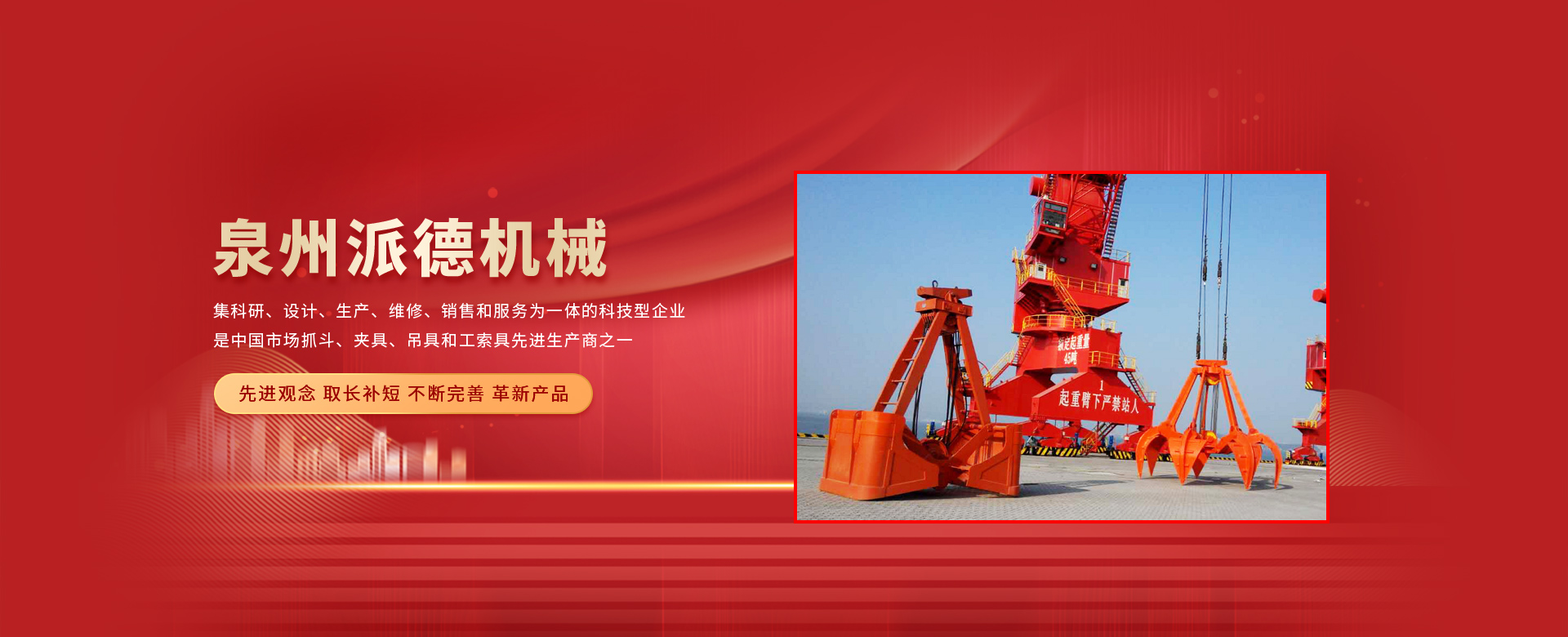 泉州派德機械有限公司成立于2012年5月,位于全國文明的古城福建泉州,公司擁有各類型專業(yè)員工82人,其中高級工程師1人,工程師4人,助理工程師5人,是一家集科研、設(shè)計、生產(chǎn)、維修、銷售和服務(wù)為一體的科技型企業(yè),是中國市場抓斗、夾具、吊具和工索具先進(jìn)生產(chǎn)商之一。產(chǎn)品采用國內(nèi)外先進(jìn)的設(shè)計方案、技術(shù)規(guī)范、制造過程、工藝流程和服務(wù),憑借在抓斗、夾具、吊具和工索具領(lǐng)域的超前設(shè)計理念和成熟的技術(shù)、工藝和管理,在抓具領(lǐng)域迅速崛起。